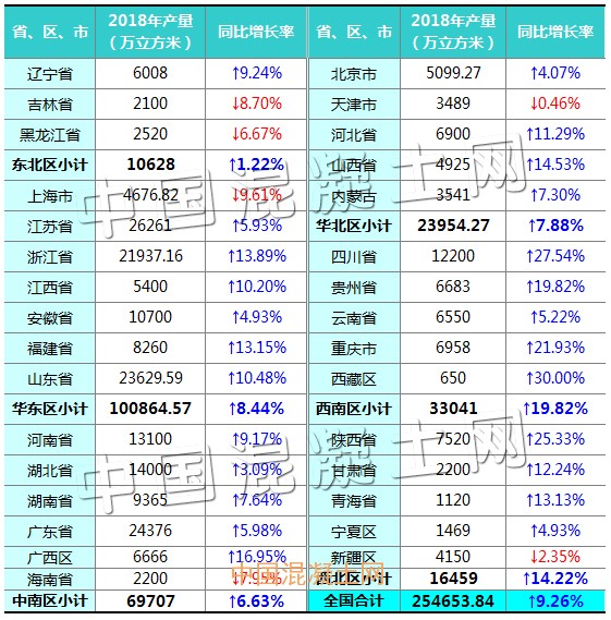 2018年中国各省市商品混凝土产量及增长情况